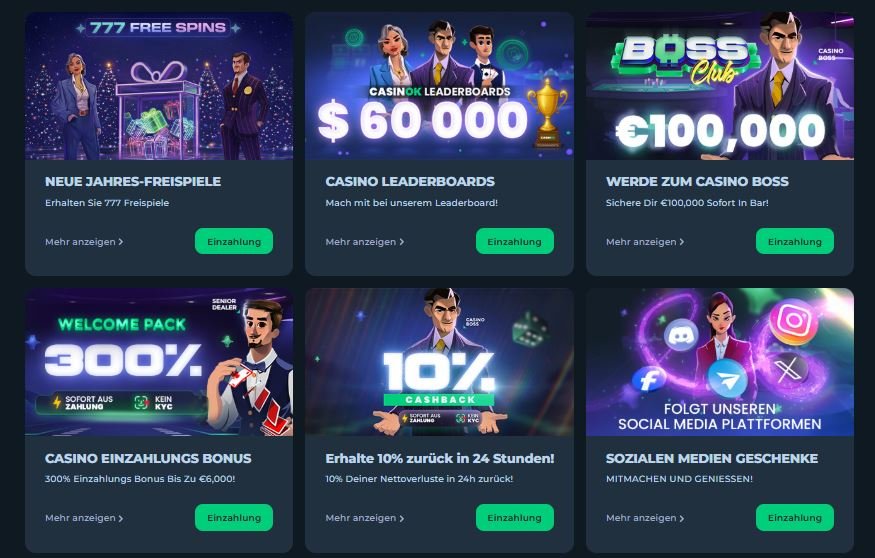 Die Angebote von CasinoOK sind klar strukturiert und auf aktive Nutzung ausgelegt. Statt vieler kleiner Aktionen setzt die Plattform auf wenige, aber groß dimensionierte Promotionen. Der Fokus liegt auf Einzahlungsboni, Cashback und langfristigen Vorteilen über das VIP Programm.