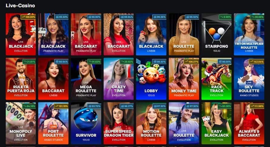 Die Spielauswahl ist klar strukturiert und wirkt angenehm aufgeräumt. Die Kategorien sitzen logisch: Slots, Live Casino, Gameshows, Neuerscheinungen, Blackjack, Roulette und Baccarat. Trotz der großen Gesamtzahl an Spielen bleibt die Webseite übersichtlich und reagiert schnell.
