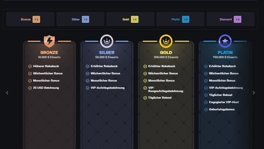 Der VIP Bereich besteht aus fünf Stufen. Jede Stufe bringt messbare Vorteile, die in einer klaren Tabelle dargestellt werden. Besonders gut ist die Transparenz. Man sieht sofort, welche Stufe welche Features freischaltet und wie sich die Benefits steigern.
