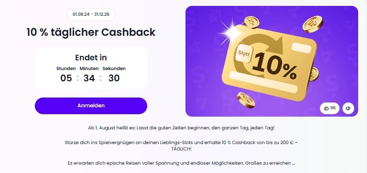 Der tägliche Cashback von 10 % auf Nettoverluste gehört zu den stärkeren Features bei Slott. Die Gutschrift erfolgt automatisch, ein manuelles Beantragen ist nicht nötig. Der maximale Cashback-Betrag liegt bei 200 €, was realistisch angesetzt ist.
