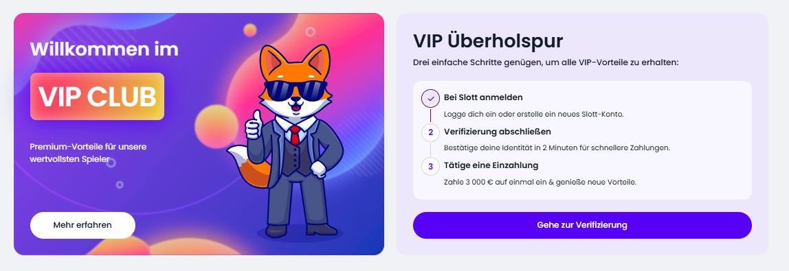 Der VIP-Club ist bei Slott klar positioniert und bewusst nicht für jeden sofort erreichbar. Voraussetzung sind eine abgeschlossene Verifizierung sowie eine Einmal-Einzahlung von 3.000 €, um in den VIP-Status aufzusteigen. Diese Hürde ist deutlich und genau das macht das Programm extrem glaubwürdig.