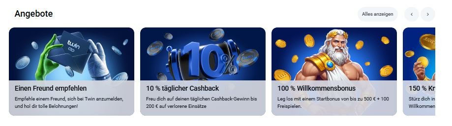 Twin Casino bietet einen täglichen Cashback auf verlorene Einsätze. Im Test erwies sich dieses Modell als übersichtlich und fair umgesetzt.