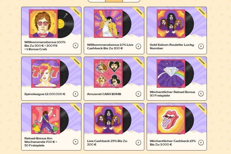 Vinyl Casino beschränkt sich nicht auf einen Willkommensbonus und lässt Bestandskunden danach in der Wüste stehen. Die Aktionsseite zeigt eine ordentliche Auswahl laufender Promotionen, die vor allem Slot-Spieler und Live-Casino-Fans bedienen.