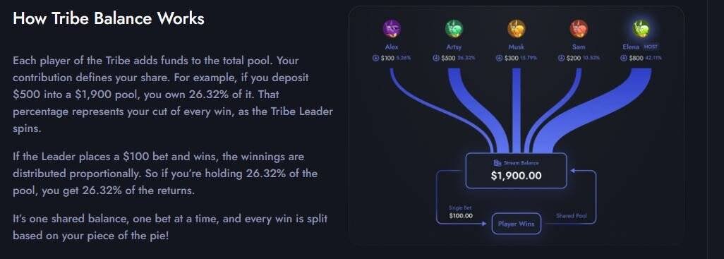 Tribes ist eines der ungewöhnlichsten Features im Casino-Bereich und eines der stärksten. Spieler können einem Tribe beitreten, der einen gemeinsamen Pool bildet. Ein Leader setzt, alle profitieren bzw. verlieren anteilig.
