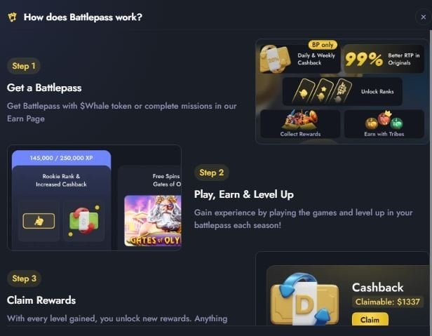Der Battlepass ist das Progressionssystem des Casinos. Es ist simpel genug, um nicht abzuschrecken, aber komplex genug, um relevant zu sein. Spieler sammeln automatisch XP, steigen in Leveln auf und schalten Belohnungen frei. Der wichtigste Punkt: Der Battlepass bestimmt, wie hoch das tägliche und wöchentliche Cashback ausfällt.